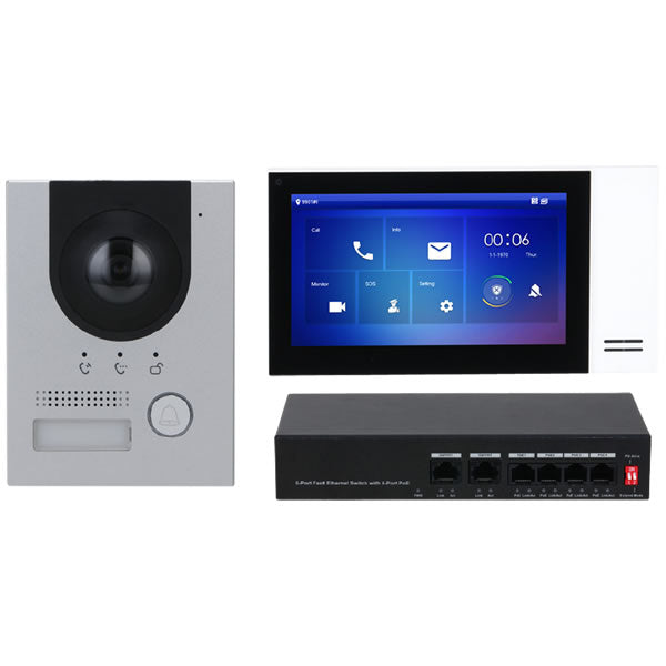 2MP HD Camera / Support two locks / App to talk and unlock / PoE / IK07&IP65 / 7" TFT touch screen / Alarm / 4 Port Switch Supports up to 250 Meters Distance PoE Transmission / Kit Includeds: DHI-VTH2421FW-P / DH-PFS3006-4ET-36 / DHI-VTO2201F-P / VTM115 (Surface mounted)
