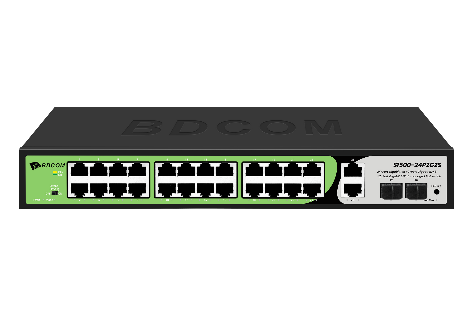 BDCOM 24-port GE PoE+ 2-port GE RJ45 + 2-port SFP Unmanaged PoE Switch, DIP function, built-in AC220V power supply; 285W PoE budget, rack-mounted installation