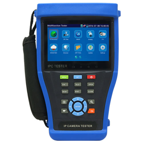 4.3" touch screen 800x480, Support IP/TVI/CVI/AHD/Analog camera test, HDMI 1080P, PoE, PING test, IP address scan, port flashing, Built-in Lithium Ion Polymer Battery